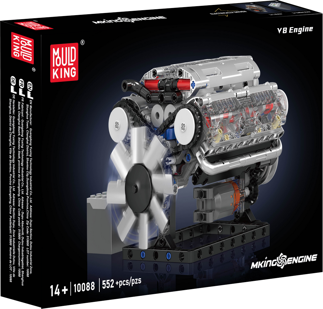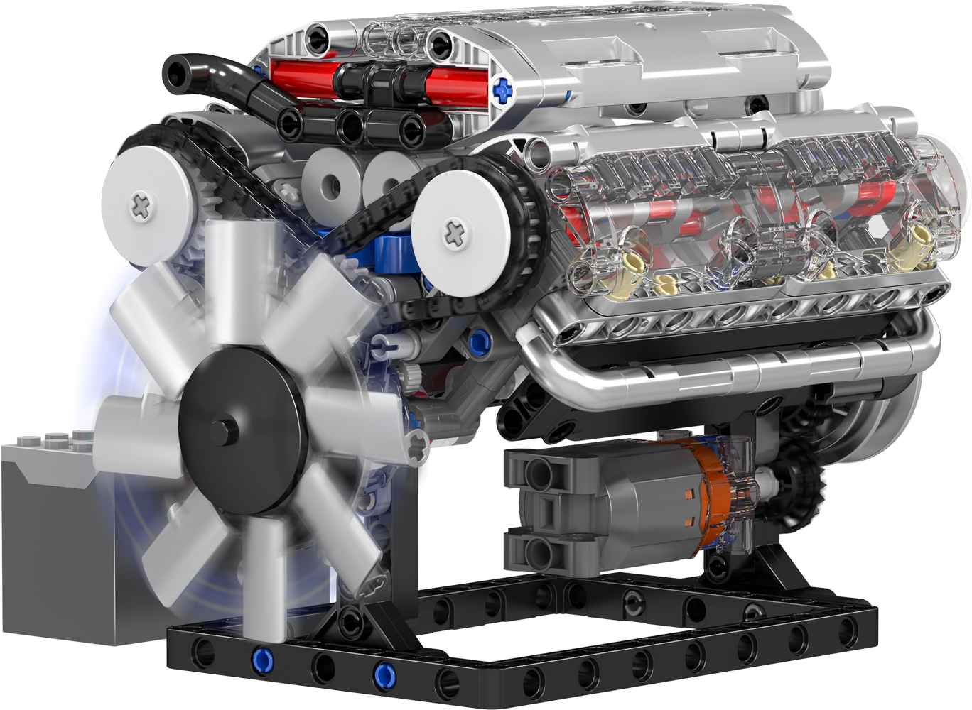 Explore this 534-piece Motorized V8 Engine model, a kit that replicates the intricate mechanics of a naturally aspirated engine. Its transparent cylinder head reveals rotating pistons and a crankshaft in harmony, alongside detailed features like a crankshaft pulley, timing chain, and radiator fan for a deep dive into engine mechanics.