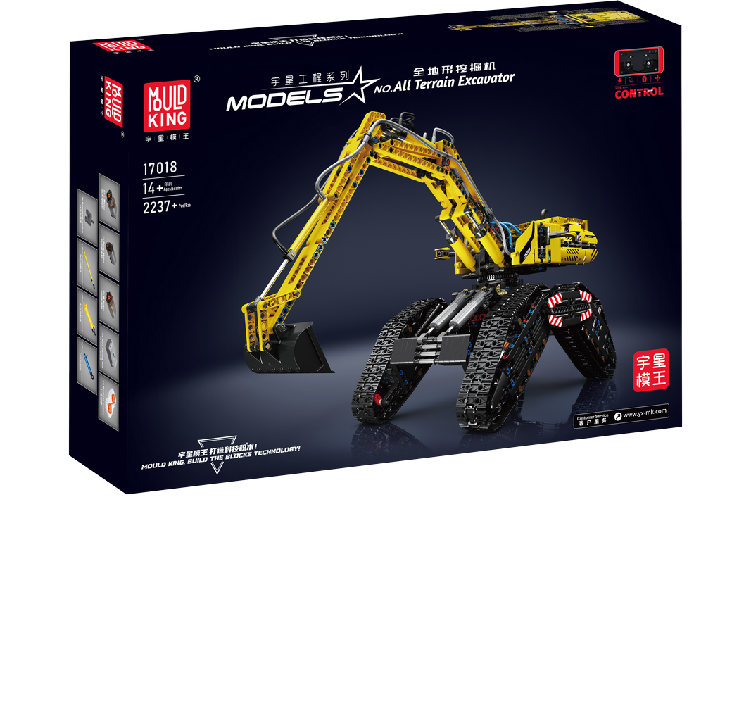 The Mould King 17018 All Terrain Excavator is created from 2,237 numbered parts with colorful paper instructions to help you easily assemble it. The model measures approximately 10 in height, 22.4 in length, and 8.1 in width.