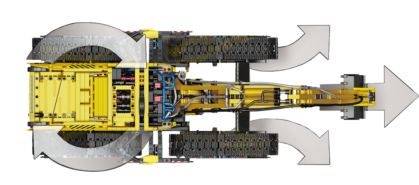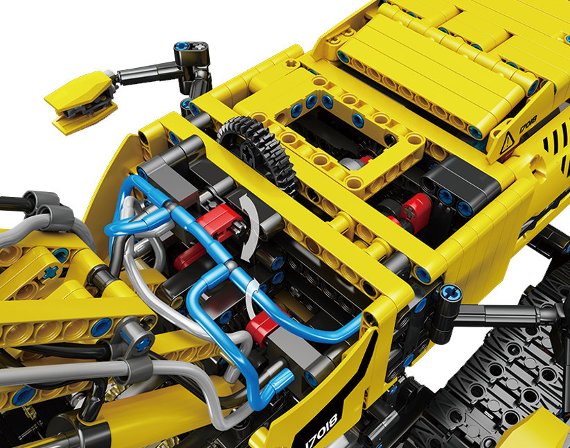 This All Terrain Excavator model includes 9 motors, 2 lithium batteries, and 1 remote control. It supports both remote control and app operation, allowing forward, backward movement and 360° rotation of the console.