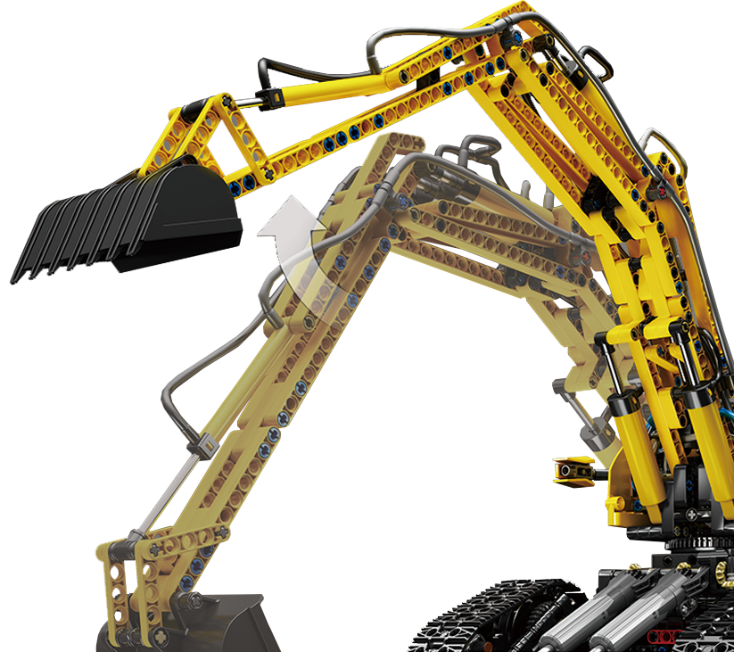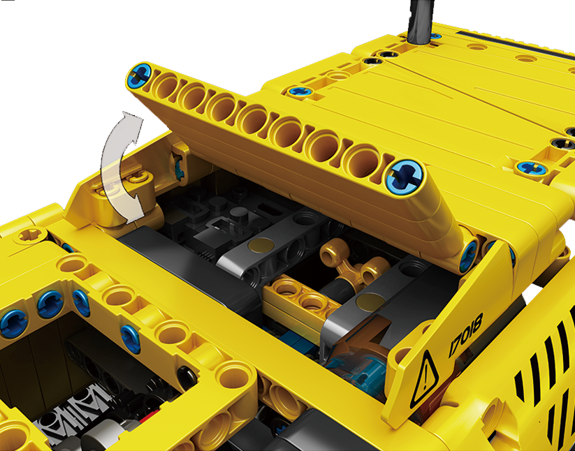 The excavator features realistic mechanisms that move like a real machine. It supports door opening, front hood opening, and 360° all-round rotation.