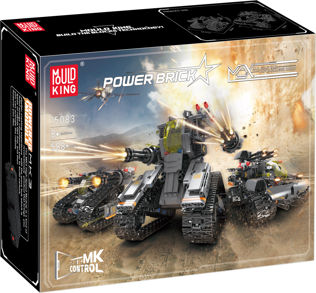 Explore the Mould King 15083 3in1 Military Robots set, a versatile building kit that allows you to construct three distinct military-inspired models from one set: an armored tank, a defense turret, and a reconnaissance vehicle, each with its own set of tracks for all-terrain navigation.