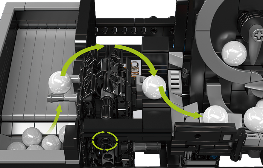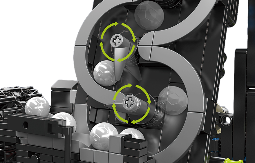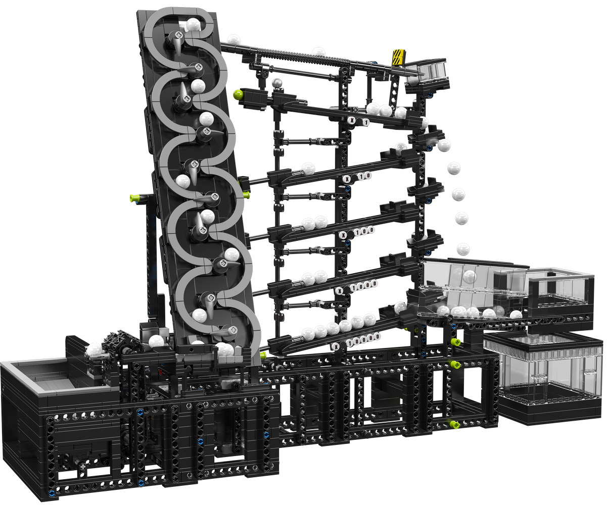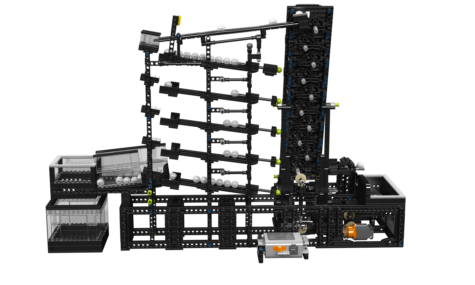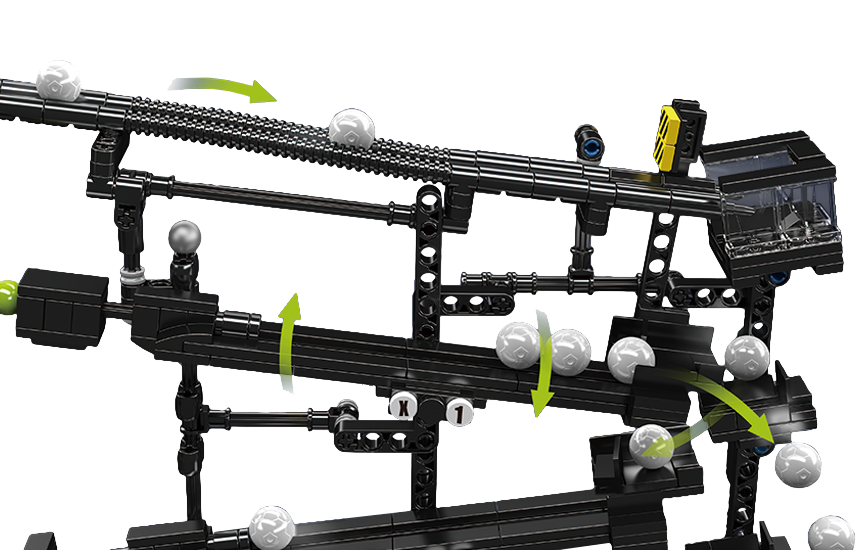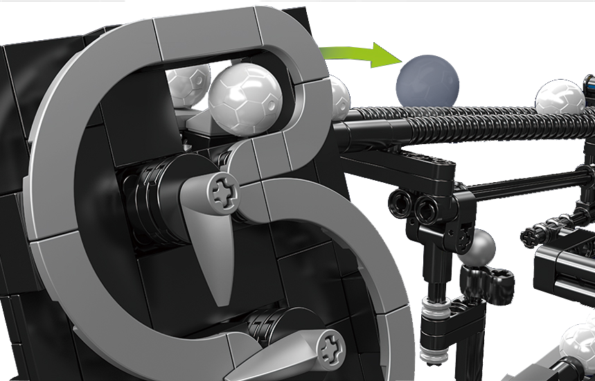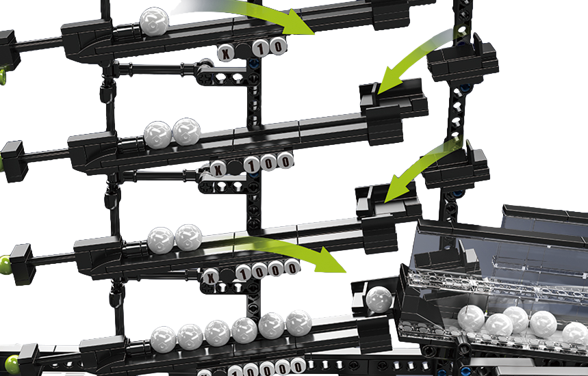 The magic unfolds as the ramp, holding up to ten spheres, tips elegantly to the side. Nine balls cascade into a waiting chamber while a single ball descends onto a lower path—preparing for the next round of calculation.